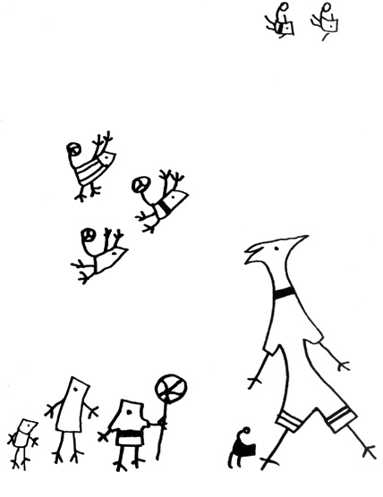 Та тя легна да мъти, а ние подфъркаме наоколо и я шпионираме. Кой знае какво за шпиониране нямаше, но за всеки случай шпионирахме, а най-вече с тая работа се занимаваше Пешеходецът, който си подсвирква с уста. На него това най-много му се удава, щото свраката едва ли щеше да се подсети, че той я шпионира. Пешеходецът, който си подсвирква с уста си върви най-безобидно и с най-разсеян вид подсвирква, ще помислиш, че е човек, тръгнал просто да си подсвирква. Той обаче с едно око подсвирква, а с другото око шпионира свраката. А свраката, нали е глупава, хич даже и не може да се подсети, че я шпионират. Какво ли си мисли тя: Това е врабешки народ, по цял ден гони насекоми, мигар ще седне да ме шпионира!