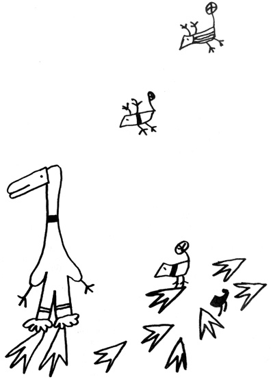Тогава всички слязохме от плевнята в двора и един през друг почнахме да рисуваме. Кой нарисува една кръстачка, кой нарисува две кръстачки, а смрадовранката почна да рисува две кръстачки и една фльонга ... две кръстачки и една фльонга, Дебелачко нарисува дебелачко и половина, Запетайчето изпъстряше снега със запетайки, Пиук се развъртя, та посред двора нарисува врабче, което се къпе в снега. Вярно е, че голямо въображение се искаше, за да може човек да разбере, че това е точно врабче, което се къпе в снега; всъщност за нас по-важно бе да рисуваме врабчета, а не дали всеки ще познае какво е нарисувано. Краката му стърчат навън също нарисува себе си, само че краката му останаха да стърчат извън рисунката.